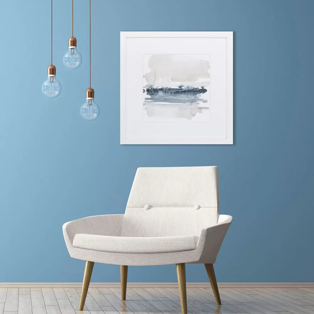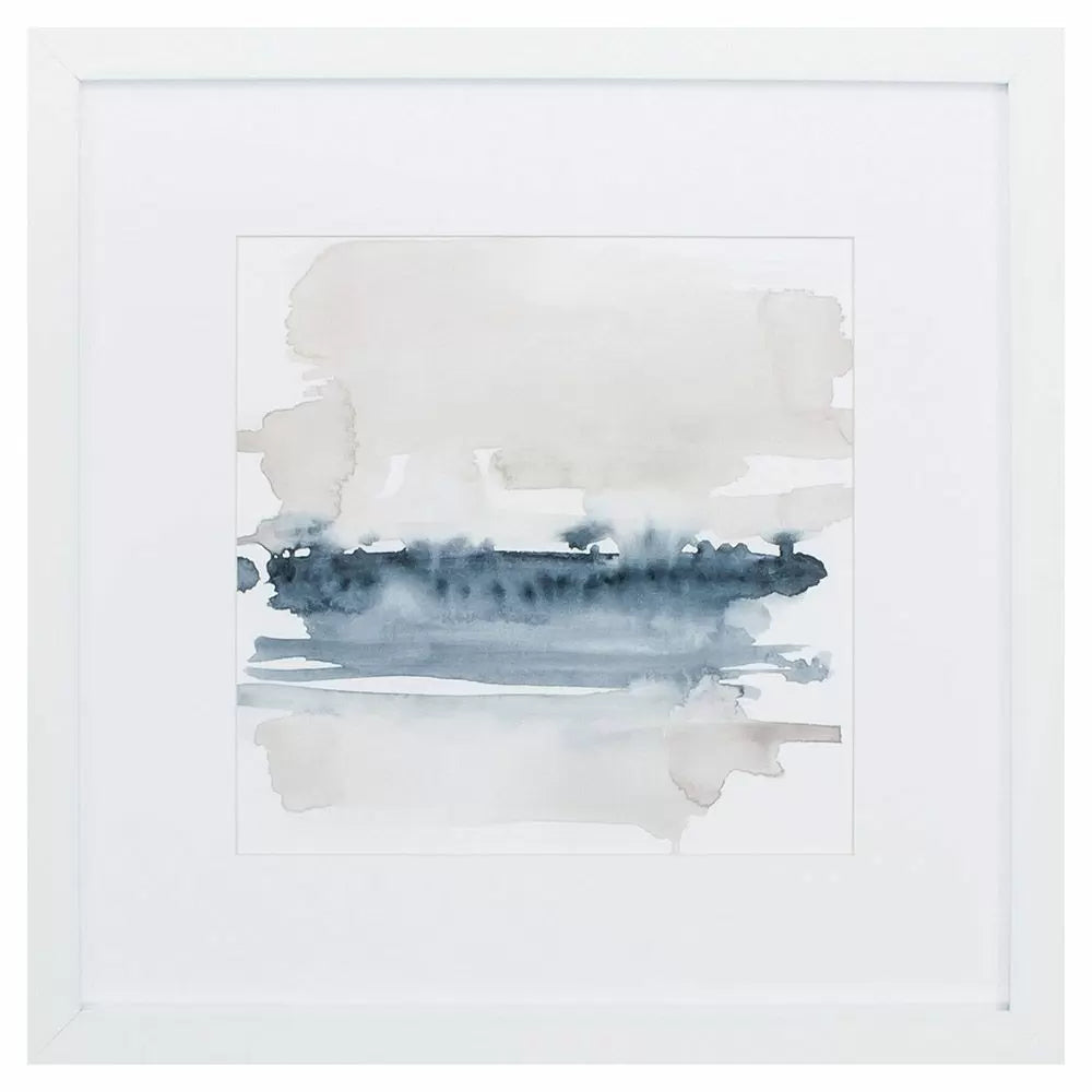 An abstract image that has a single white mat and framed under glass with a sleek white moulding.