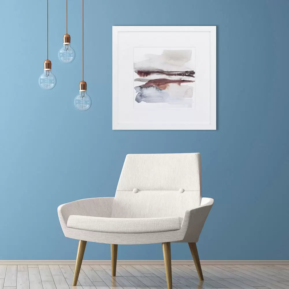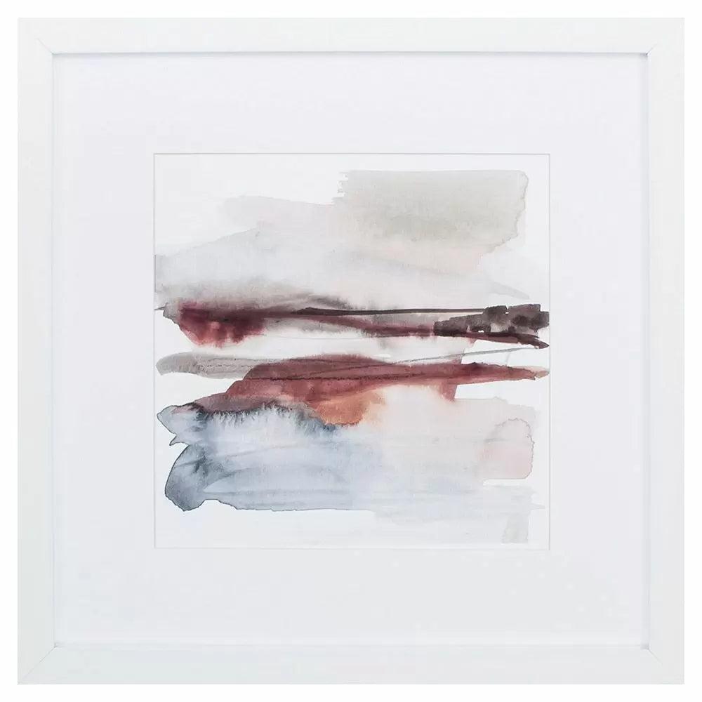 An abstract image that has a single white mat and framed under glass with a sleek white moulding.