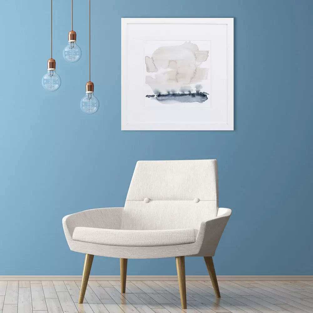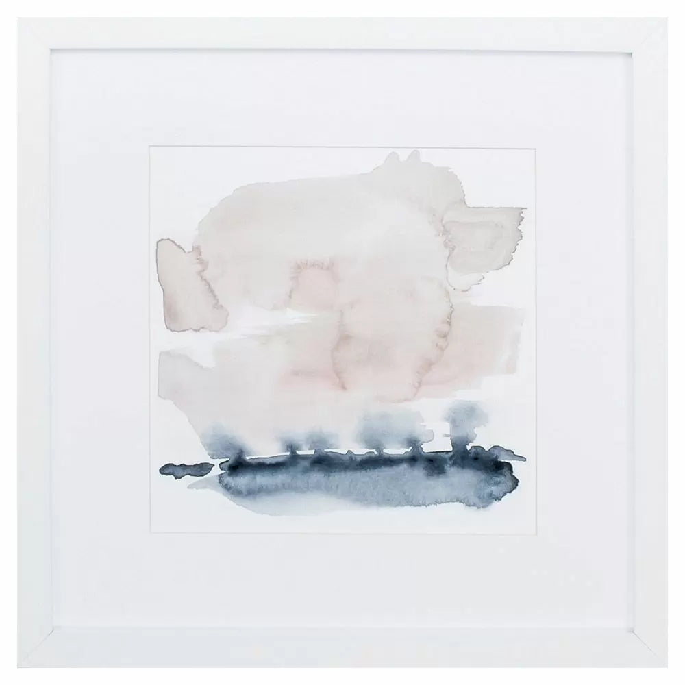 An abstract image that has a single white mat and framed under glass with a sleek white moulding.