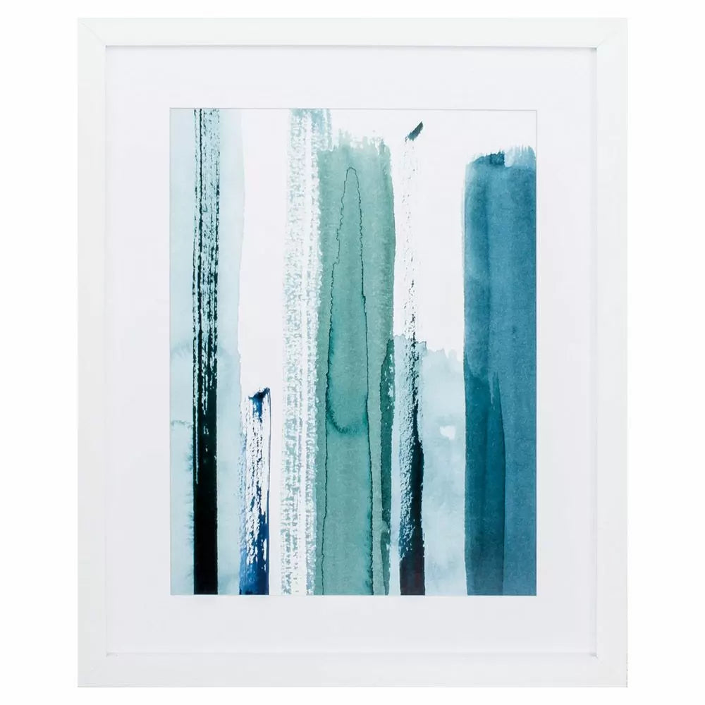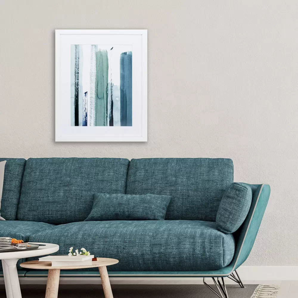 A teal abstract image that has one white mat and has been framed under glass with a white moulding.