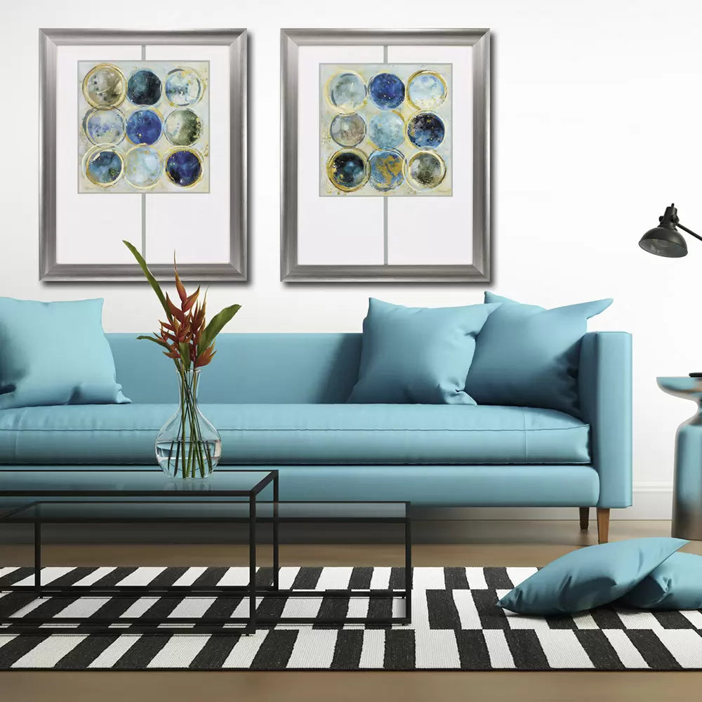 One out of a set of two double matted with a heavy bottom and a channel cut. They come finished under glass in a brushed silver frame.