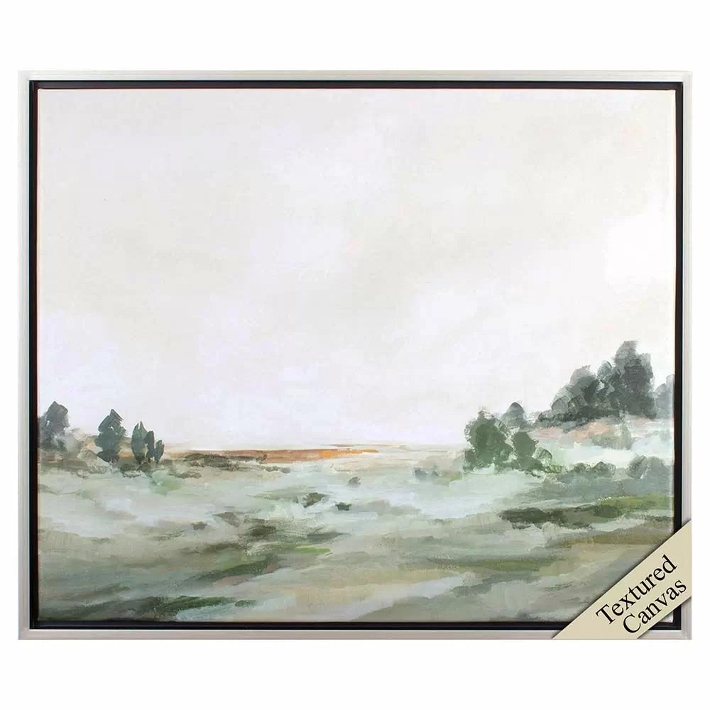 A landscape scene canvas that has a hand applied acrylic overlay. This non glass piece is finished with a silver frame.