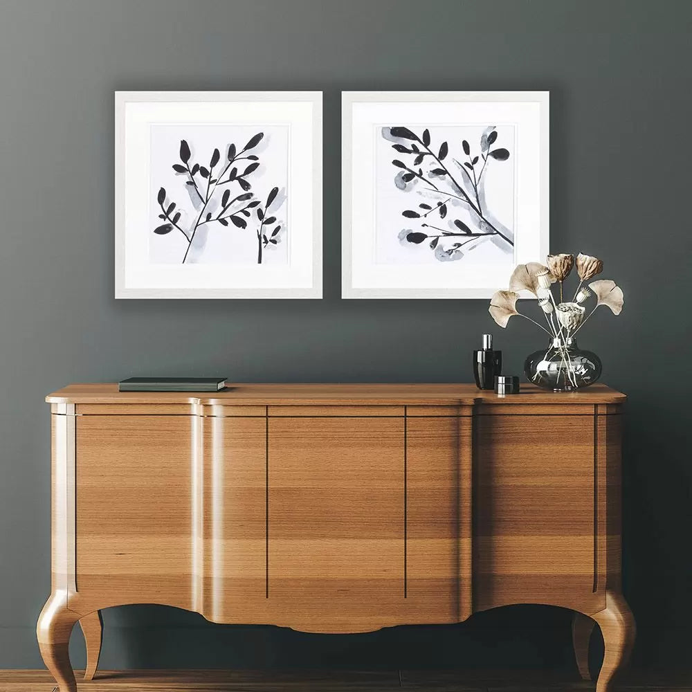One out of a set of two monochromatic branches that are double matted and framed under glass with a white wash frame.