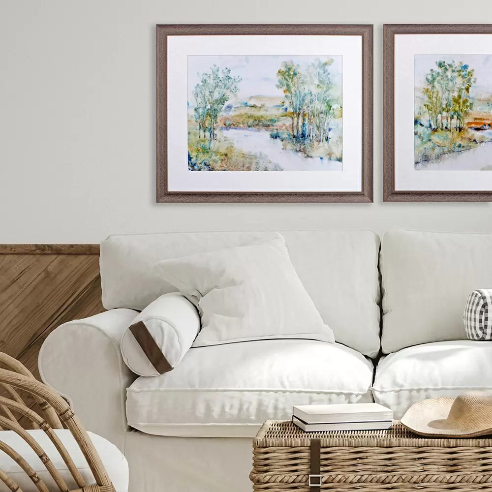 A landscape image that is accentuated with a patterned mat and finished with a wood tone frame.