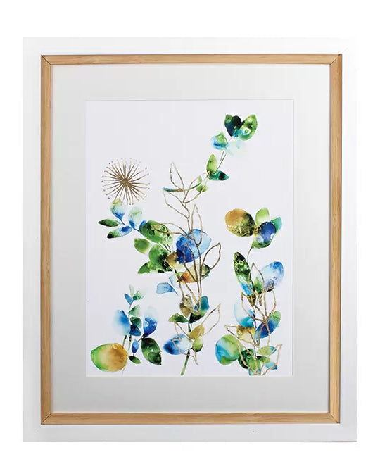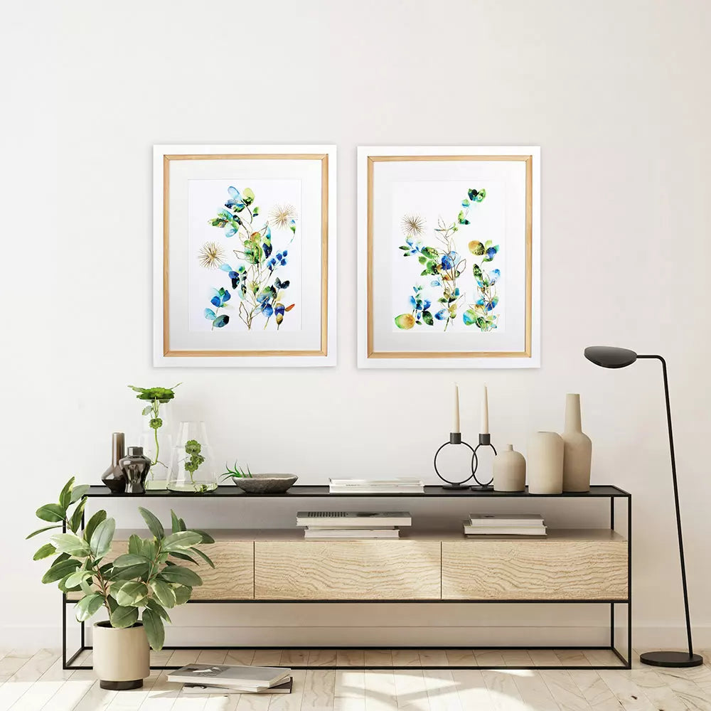 One out of a set of two colorful foliage dance alongside gilded starburst shapes in these joyful prints.