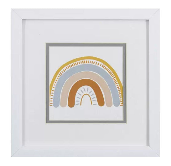 One out of a set of two playful rainbow images that are double matted and framed under glass in a white moulding.