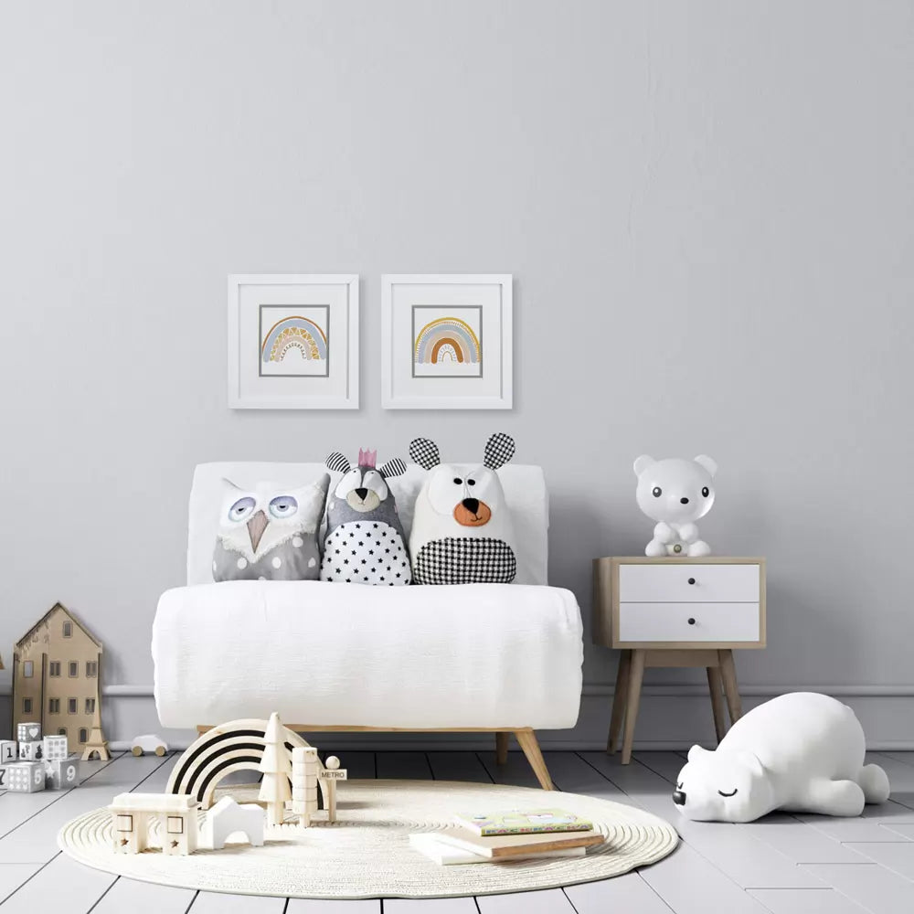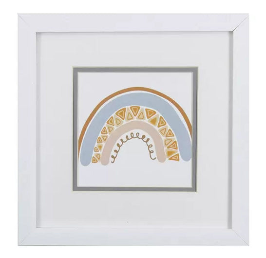 One out of a set of two playful rainbow images that are double matted and framed under glass in a white moulding.