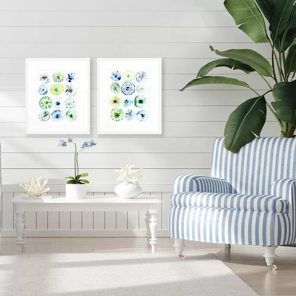 One out of a set of two coastal sea urchin prints that are double matted, framed under glass and paired with a white frame.