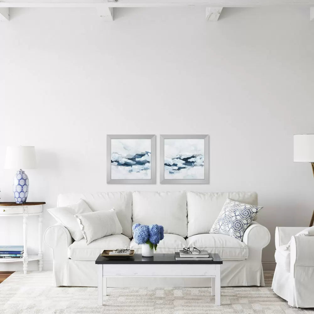This set of blue abstract images have been framed to size under glass in a silver molding.